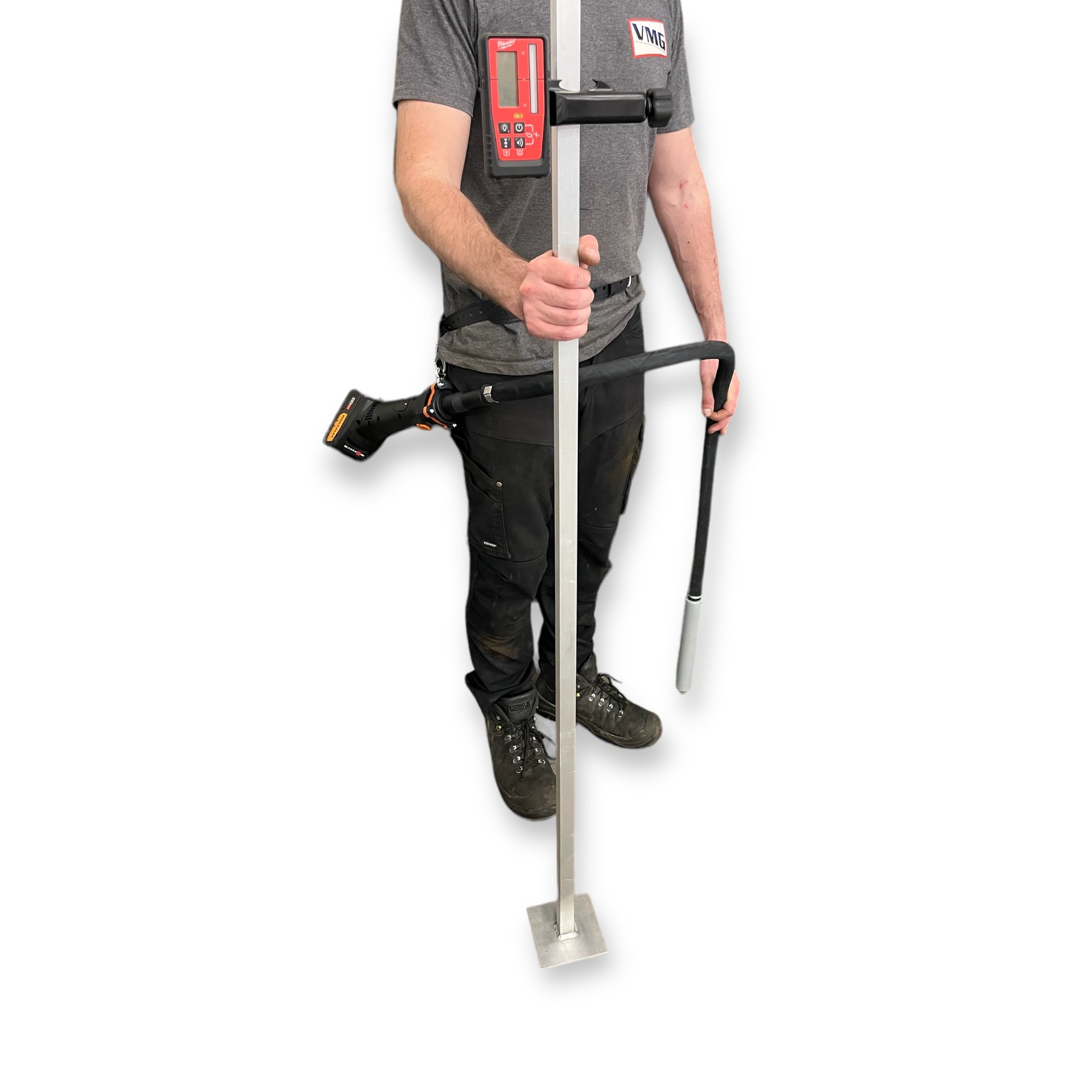 Het aandrijfunit wordt met een riem gedragen en de slang is 1,3m lang. Hierdoor is er voldoende bewegingsvrijheid en blijft er een hand vrij om hoogtes te meten met een baak / hoogte lat.
