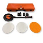 Zeer complete levering inclusief 2x 10Ah accu, snellader, wafelstructuur schuurschijf, gladde schuurschijf, sponsrubber schijf en transportkoffer.